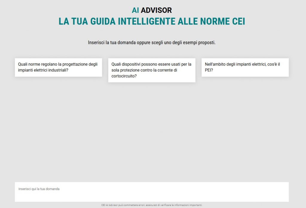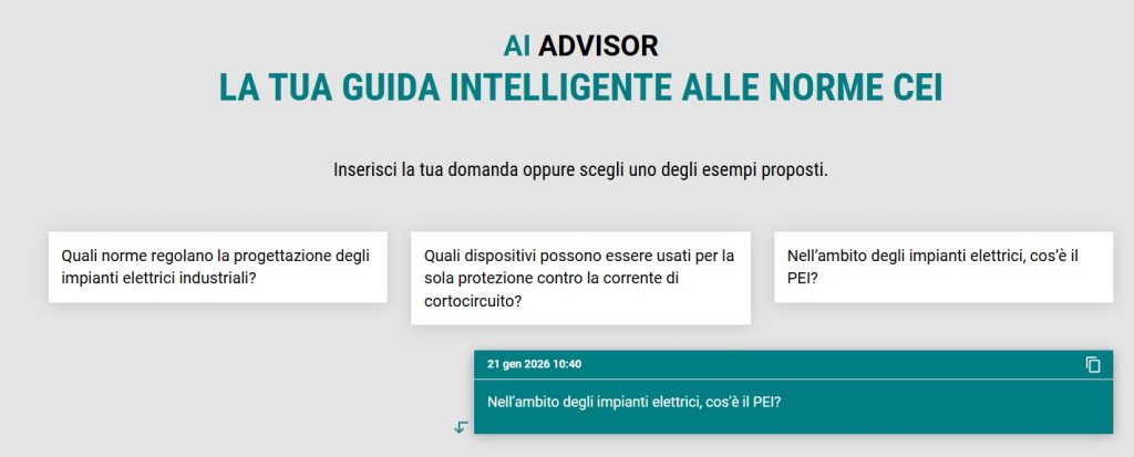 CEI AI Advisor è un servizio di intelligenza artificiale che permette di formulare domande in linguaggio naturale (in italiano o in inglese) circa i contenuti delle norme incluse nel proprio abbonamento e di ricevere risposte, nella stessa lingua della richiesta, generate da una piattaforma di IA.