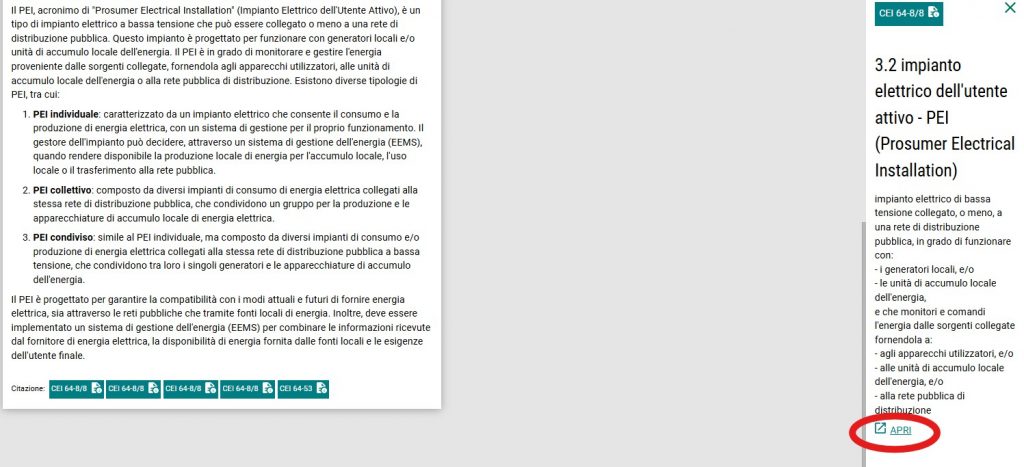 Alla fine del testo del paragrafo è fornito il pulsante “Apri” che porta alla scheda del documento normativo, nel catalogo CEI, da cui la norma può essere aperta.